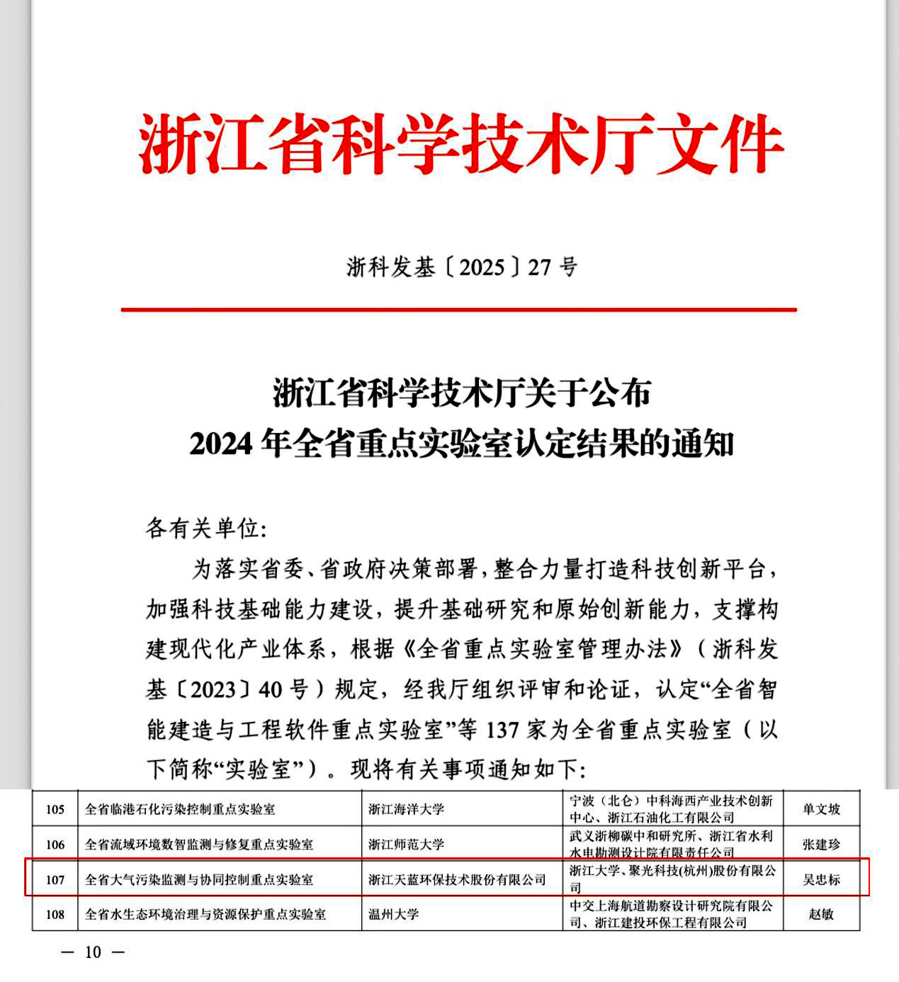 2025年6月4日,浙江省科技廳發(fā)布《浙江省科學技術(shù)廳關(guān)于公布2024 年全省重點實驗室認定結(jié)果的通知(浙科發(fā)基〔2025〕27號)》,由浙江天藍環(huán)保技術(shù)股份有限公司牽頭,浙江大學和聚光科技(杭州)股份有限公司共建的“全省大氣污染監(jiān)測與協(xié)同控制重點實驗室”獲批組建,成為全省環(huán)境領(lǐng)域唯一以企業(yè)牽頭建設的省級重點實驗室
